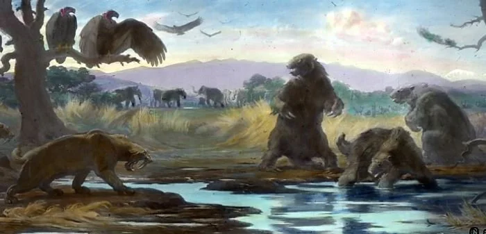 La Brea Tar Pits fauna showing giant sloth trapped in a lake, as depicted by Charles R. Knight