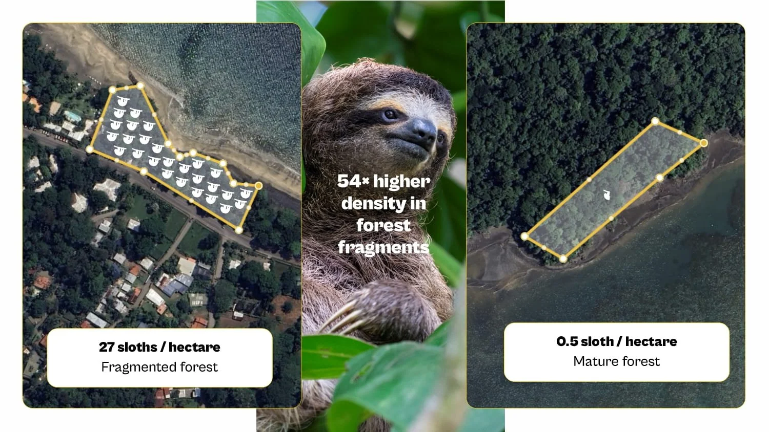 To us, the loss of a single tree might seem insignificant, but to sloths, it can mean the difference between life and death. They become trapped in small pockets of isolated forest and are unable to disperse safely. Our census data is revealing that sloth population densities can become up to 54 times higher in urban forest fragments than in mature, intact forests.