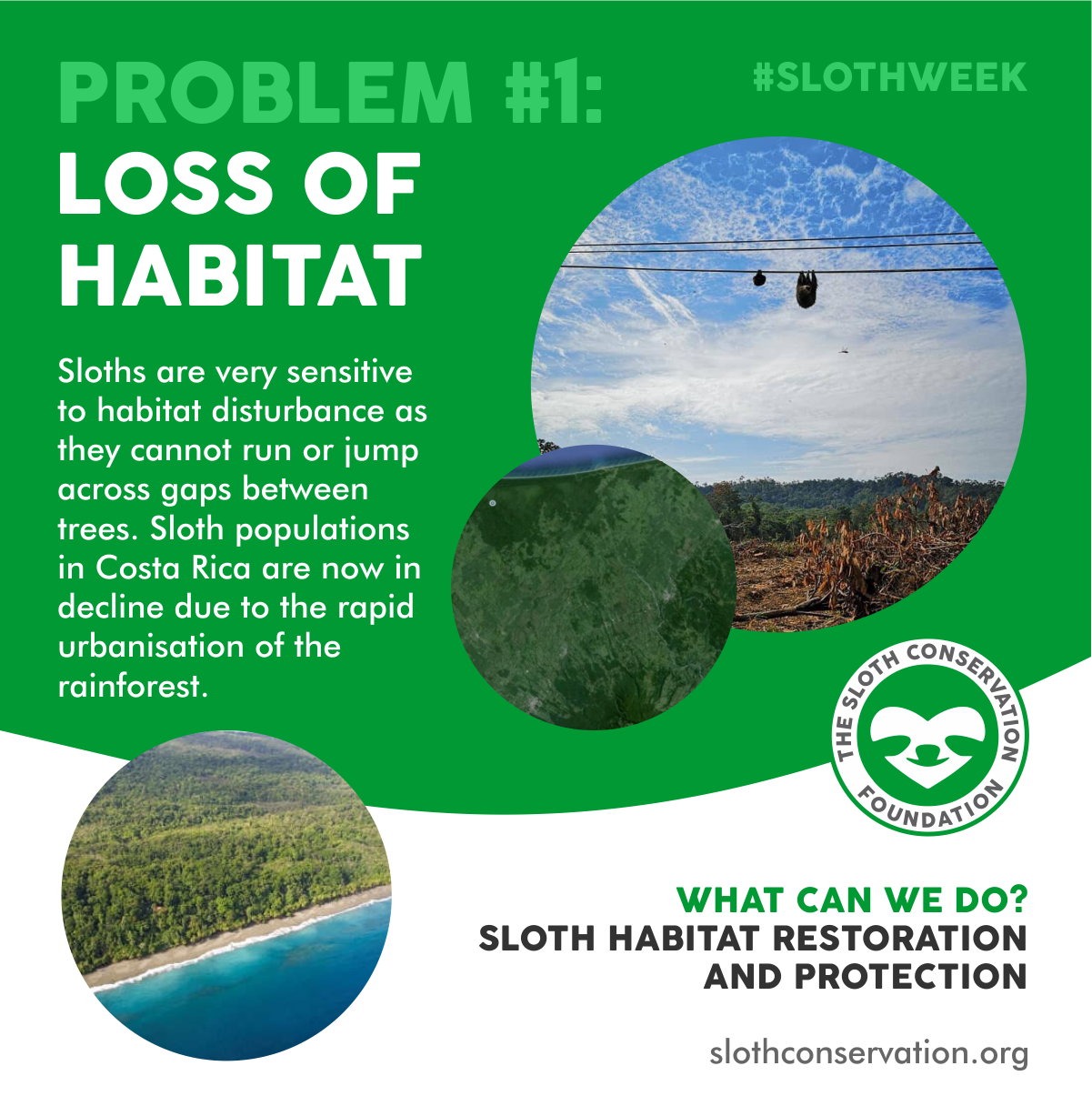 Kicking things off with the number 1 threat to wild sloth populations in Costa Rica - habitat loss. Sloths rely on a continuous rainforest canopy for survival as they are physically unable to traverse big gaps between trees. As humans encroach further and further into the rainforest, more trees are cut down and the forest is fragmented which leaves the sloths very vulnerable.