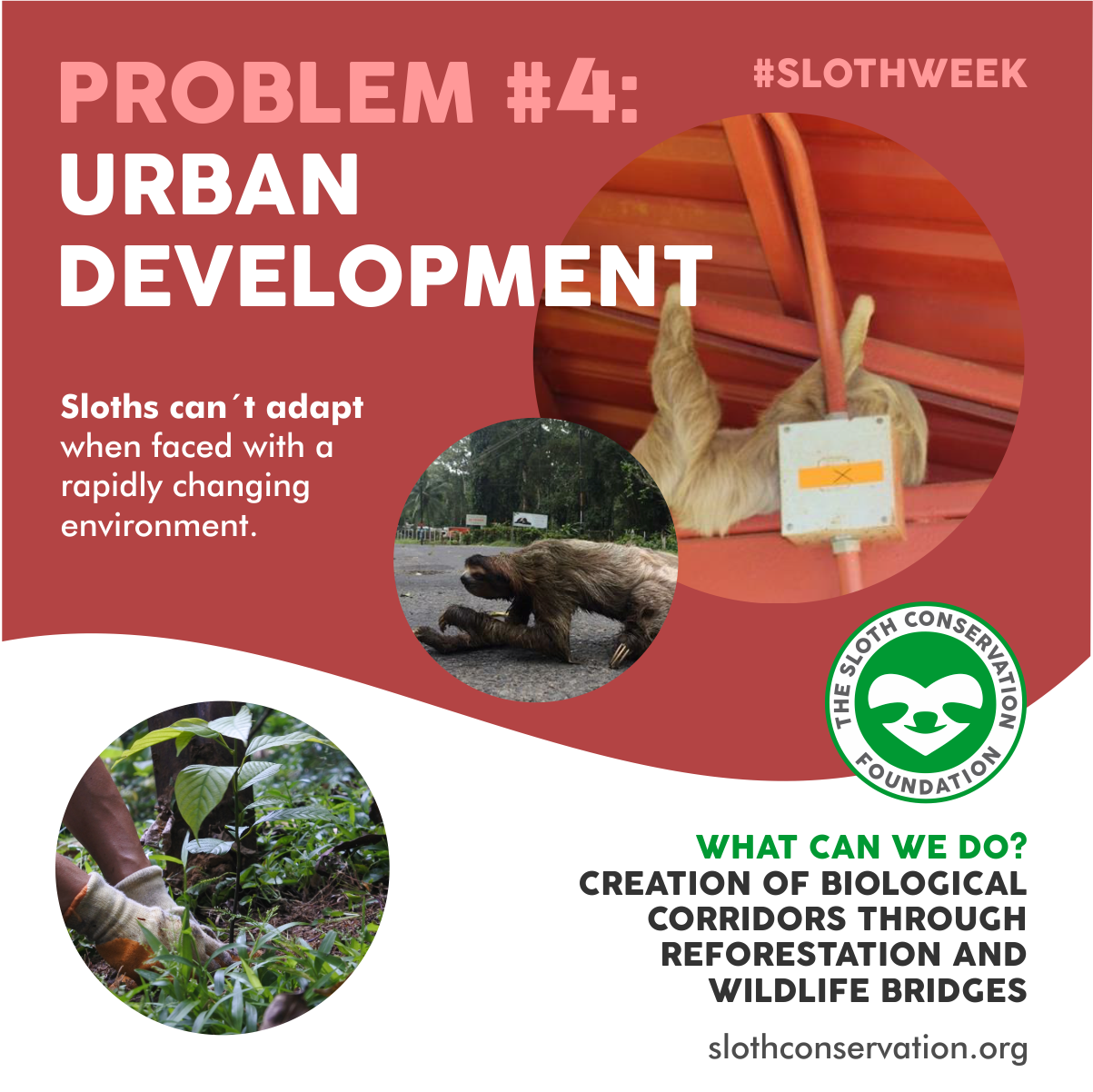 However, the rapid development of the sloths' habitat means that the connectivity between neighboring trees is being lost and the sloths are being forced to travel around on the ground where they are vulnerable.