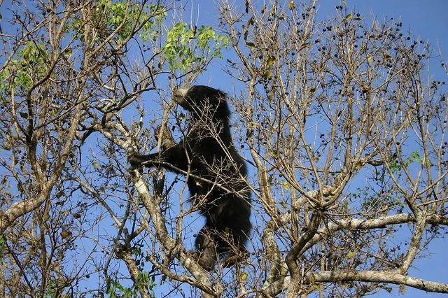 Sloth Bears thrive in the Indian subcontinent’s diverse environments like dry forests, grasslands, wet forests, and mountains. They favor rocky outcrops and caves for daytime shelter. The tropical climate in these regions is marked by high temperatures and substantial rainfall, fostering a biodiverse environment.