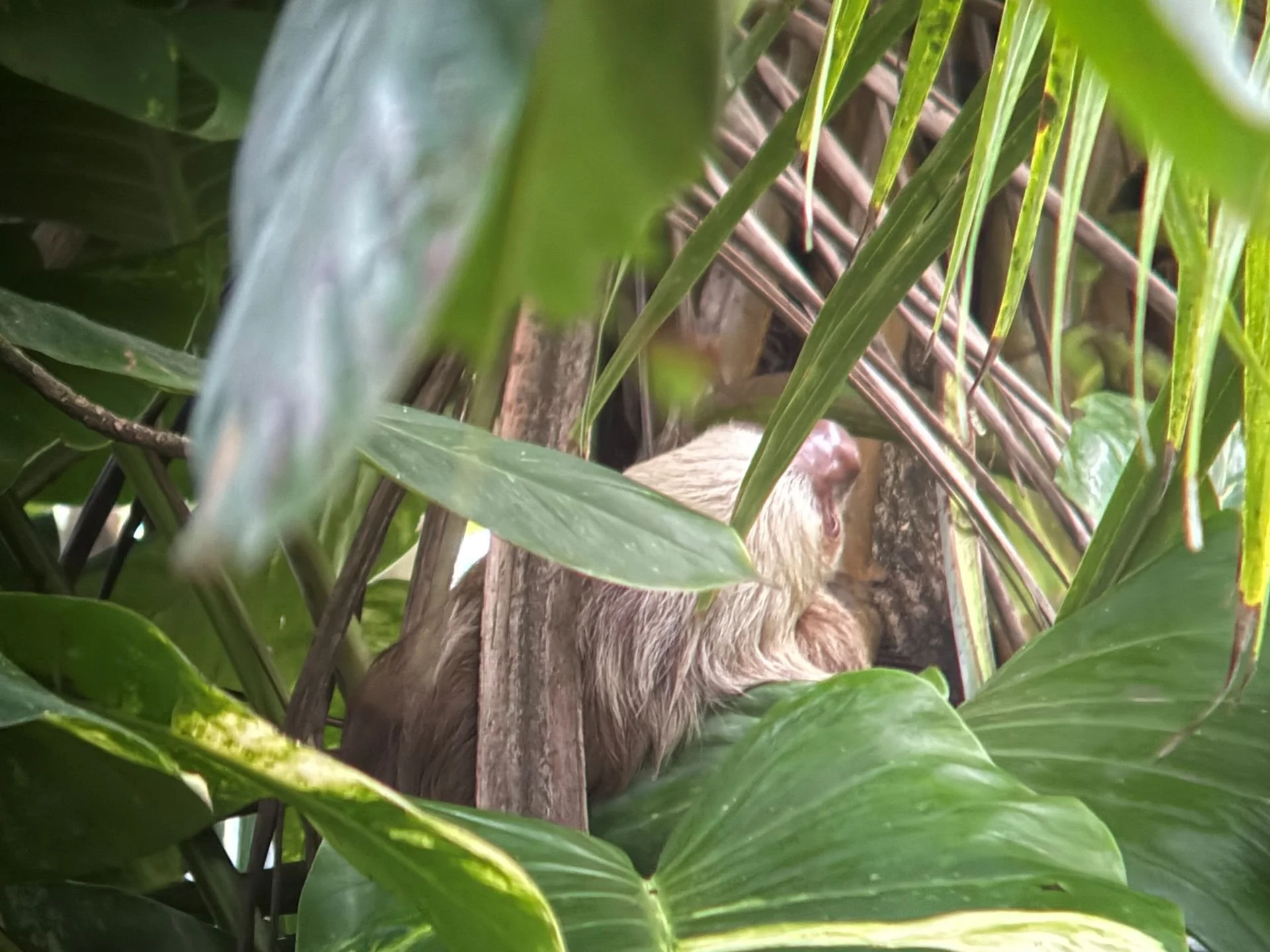 The following day brought a twist: the signal had shifted to an unusual tree near the road. The area was bustling with tourists and locals, all curious about our strange antenna and what we were tracking. From the ground, we spotted a large two-fingered sloth, but the signal didn’t match. Moments later, we noticed two other two-fingered sloths in the same area. After careful observation, we traced the signal to a beach almond tree. The antenna wasn’t visible, but judging by size and position, we suspected Debbie was the lower, larger sloth in the tree.
