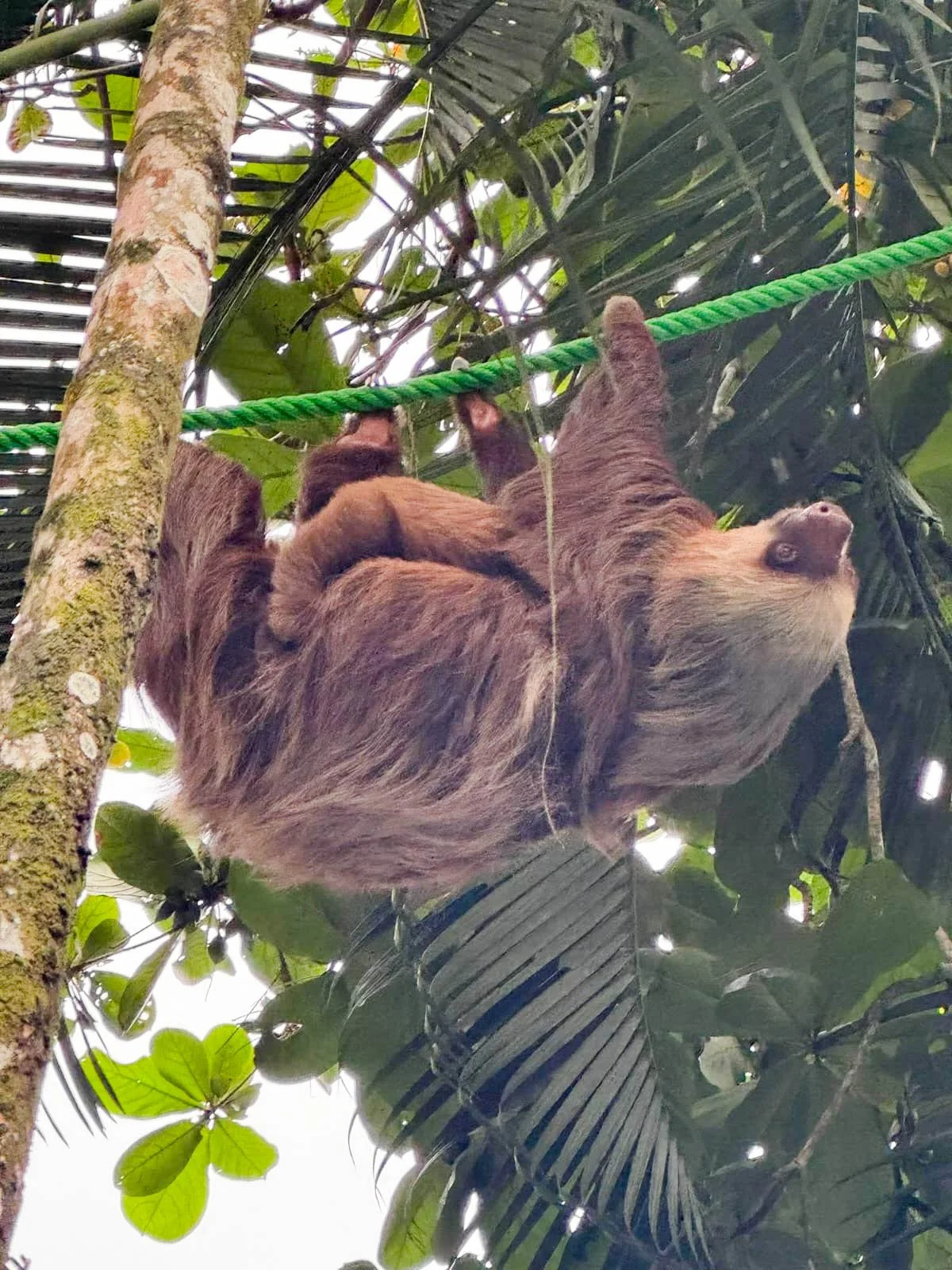 On a cloudy, windy day, we first spotted Tango in a new tree right at the edge of the Tasty Waves property. While monkeys and a three-fingered sloth shared the same tree, Tango chose the most sloth-appropriate response to urban chaos: a perfectly relaxed nap. Around him, a gardener trimmed plants and tourists wandered past. Life carried on, and Tango snoozed through it all.
