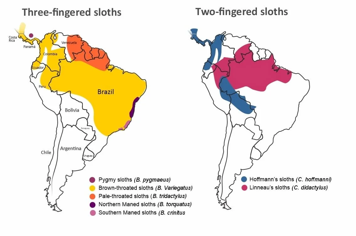 Today there are seven living species of tree sloth split between two very different genera: the three-fingered (Bradypus) and the two-fingered (Choloepus) sloths.