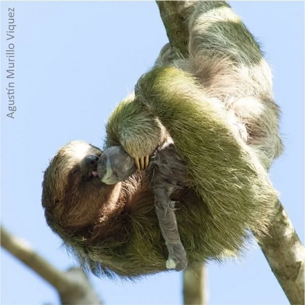 When she is ready to give birth, the mother sloth will usually descend from high up in the canopy to a lower branch and give birth while hanging upside down.