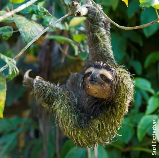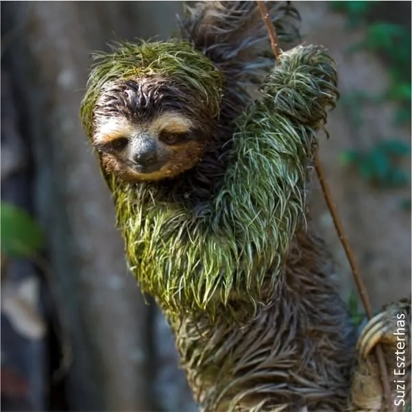 Sloth fur contains micro-cracks which trap moisture for over 80 different kinds of algae and fungi. This algae turns the sloth fur green over time and helps the sloth blend into the rainforest canopy.
