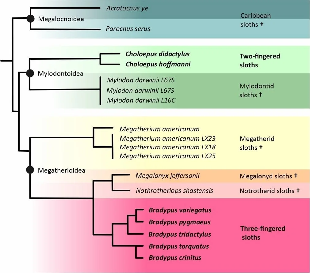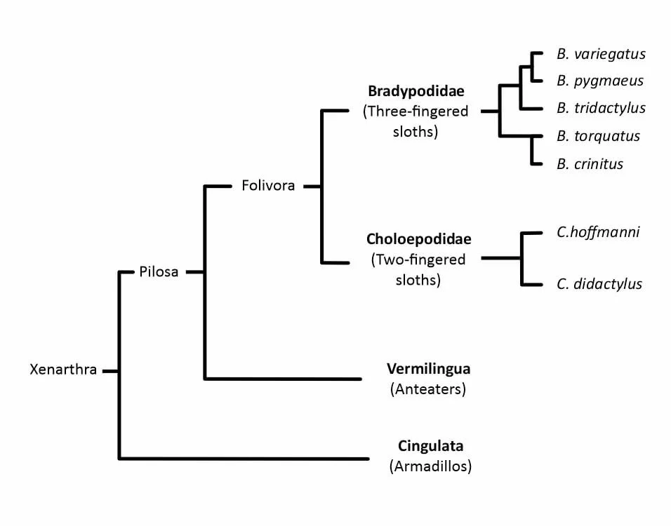 There are two living species of two-fingered sloth, thought to have diverged 6-7 million years ago.