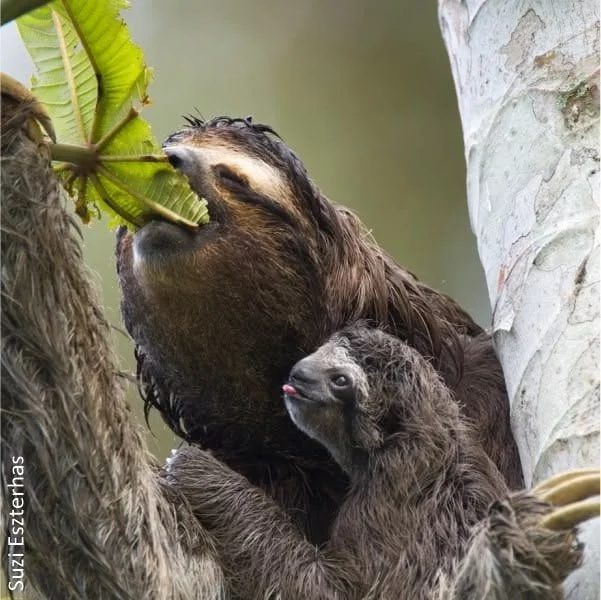 As early as one week old, baby sloths will begin sampling leaves from around their mother’s mouth in addition to drinking milk.